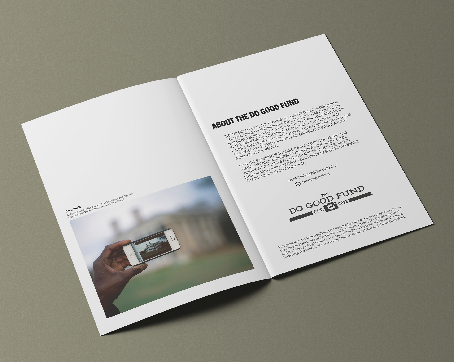 This booklet was created for attendees of the Southern Perspectives Photography Symposium, presented by The Do Good Fund. The 12 page booklet provides the information on the exhibition venues, photographers, and schedules. The clean minimal design presents the information according to the Do Good Funds brand, while not distracting from the photographs.